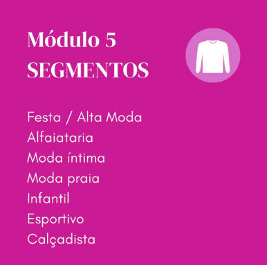 E, pra fechar, a partir deste módulo você estará apto a aplicar todos os conhecimentos sobre materiais e processos de beneficiamento aprendidos de acordo com as necessidades de cada um dos principais segmentos de moda, considerando as características e necessidades do público dos segmentos em relação a materiais, considerando questões de mercado.